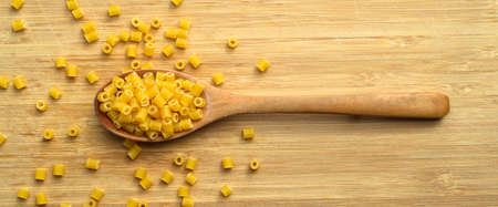 Raw fresh and healthy dry macaroni cake on wooden spoon