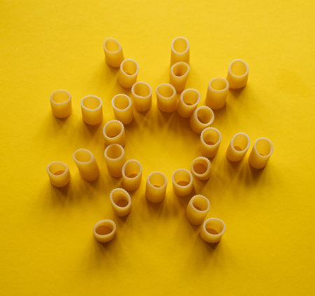 Serving of dried Ditalini pasta in the corner on a yellow background. Variety of Italian pasta. Minimalism. View from above. Copy space.