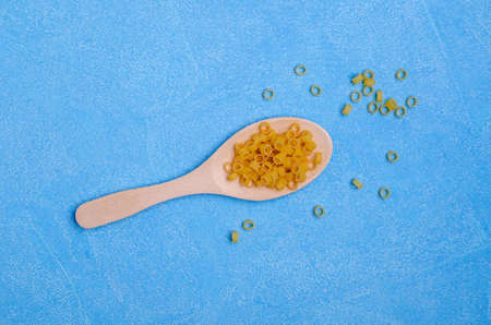Dry pasta in a wooden spoon on a blue background. Selective focus.