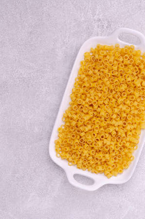 Raw Ditalini Pasta in a Bowl on a gray background, top view. From above, overhead, flat lay.