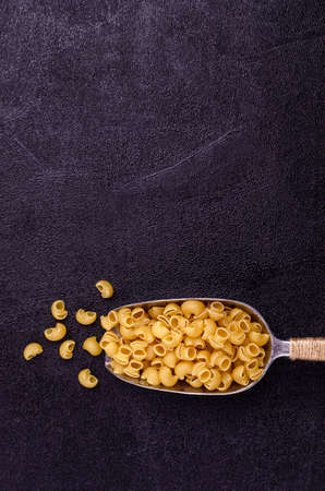 Dry pasta in a metal scoop on a blue background. Selective focus.