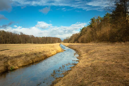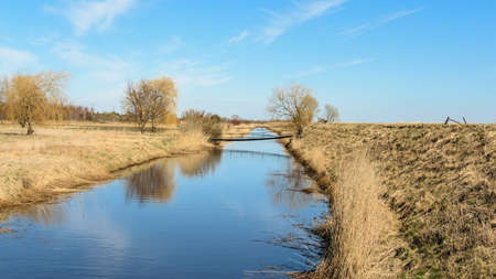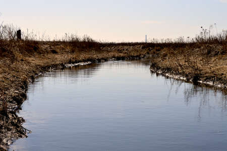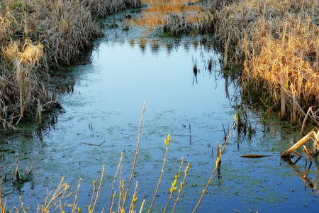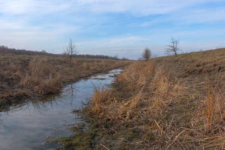 Small swampy river in the field. Wilted grasses on the banks of the river. Evening landscape.