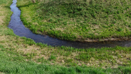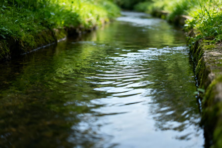 A close-up view of a freshwater stream gently flowing through vibrant green grass, capturing the essence of tranquility in a bright outdoor setting.