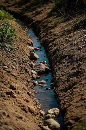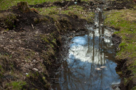 Small stream flows through the earth. The concept of environmental pollution.