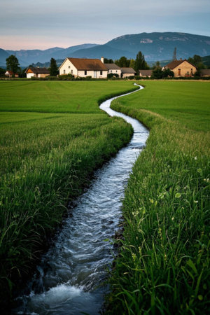Idyllic serene countryside, green fields nourished by winding streams