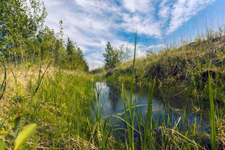 Small shallow river. Vegetation along the banks of the forest river. Landscape.