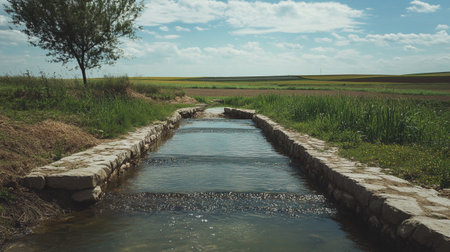 flooded irrigation canal overflowing into adjacent field, created with generative ai
