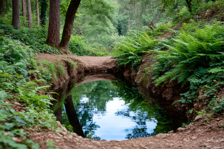Lush vegetation surrounds a small pond reflecting the trees of a green forest