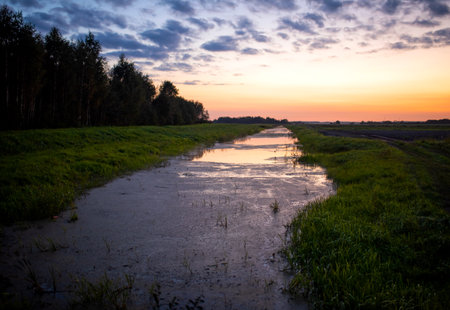 Small river in a field with green swamp water on sunset background in summer season. Wetlands declining and under threat. The problem of ecology and drainage of rivers and swamps