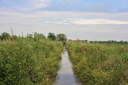 Ditch in dutch countryside landscape with cloudy sky
