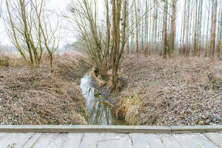 Landscape of an unusually cold snow-less February day in forest, frozen winter stream.