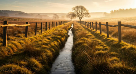 Panoramic view of a stream flowing through a meadow on a misty morning