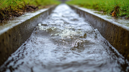 Heavy rain pouring into a concrete drainage ditch, water rippling and forming small waves.