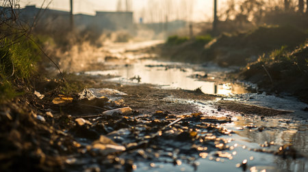 The setting sun casts a golden glow over a muddy path, highlighting puddles and debris in a scene of quiet, rustic beauty.