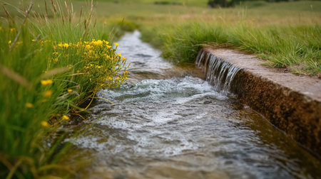 A peaceful scene showcasing a winding stream surrounded by lush grass and wildflowers, inviting tranquility and connection with nature in a serene rural landscape.