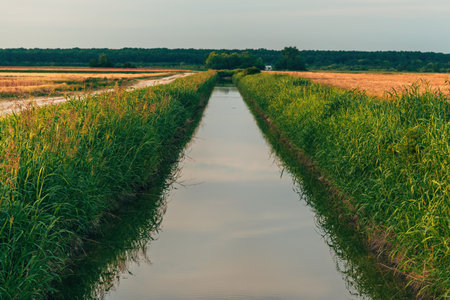 A serene irrigation channel meanders through a lush crop field, showcasing the harmony between agriculture and nature under gentle evening light.