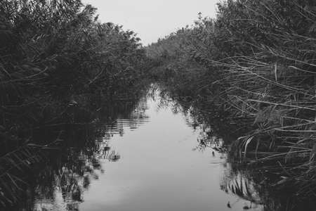 A grayscale shot of a river surrounded by grass in the evening