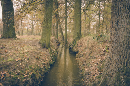 Horizontal vintage retro photo of small brook captured in cold autumn day with ground covered by brown leaves. Trees on both sides are covered by moss. Sky is covered by clouds.