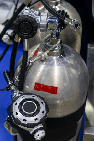 Oxygen compressed air in black steel bottles with regulators for scuba diving extreme sport on blue water background