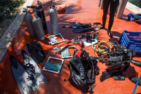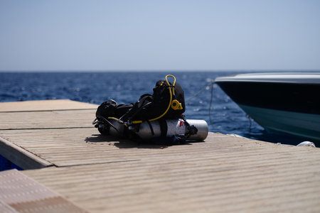 Sharm El Sheikh, Egypt - September 10, 2020: The divers equipment to dive at sail boat ship in Ras Mohamed National Park in the Red Sea, Sharm El Sheikh, Egypt on September 10, 2020