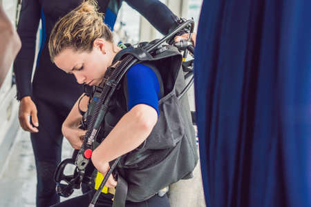 Diving instructor helps a beginner diver prepare for diving. diver helps another diver equip young guy, checks his equipment. A team of human divers is preparing for the dive checking the equipment