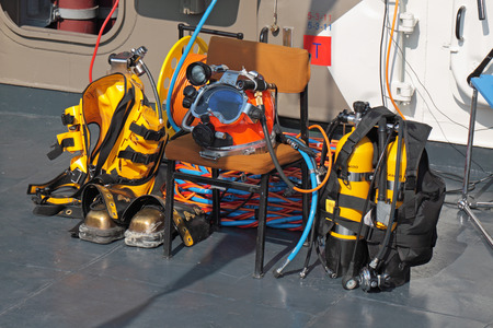 SAINT-PETERSBURG - JUN 30: Equipment for diving on the deck of a ship at the 5th international maritime defence show on Jun 30, 2011 at Lenexpo exhibition complex in Saint-Petersburg, Russia.