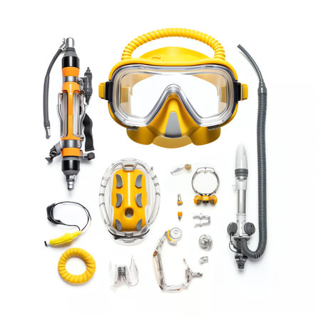 Close-up view of vibrant diving equipment, including snorkel masks and accessories, ready for underwater adventure, set against a beautiful aquatic background.