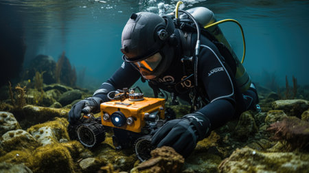 person, programming robot for dangerous underwater mission, created with generative ai
