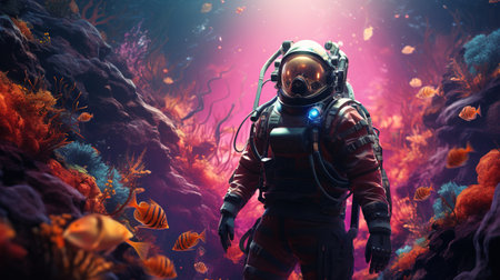 A diver in a futuristic suit explores the depths of the ocean, surrounded by marine life and coral reefs.