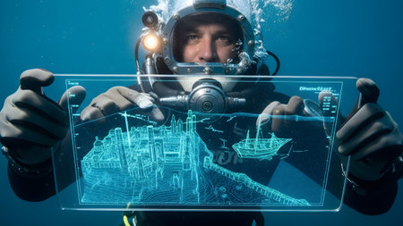Deep sea diver utilizing advanced holographic technology for underwater city and shipwreck mapping