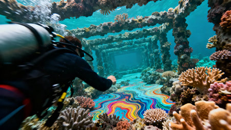underwater photographer capturing bold colors and textures of the ocean floor, created with generative ai