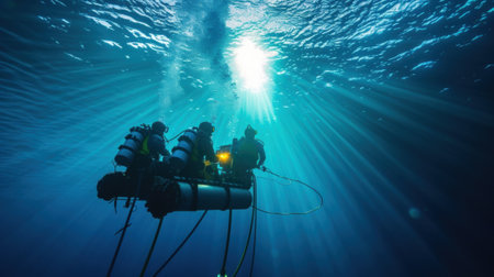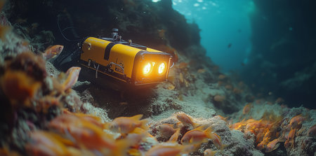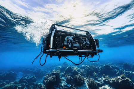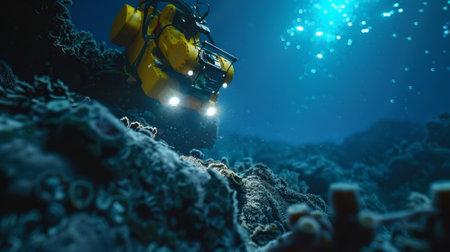 Two underwater exploration robots are navigating the deep ocean environment, capturing stunning imagery of marine life and ecosystems with advanced technology.