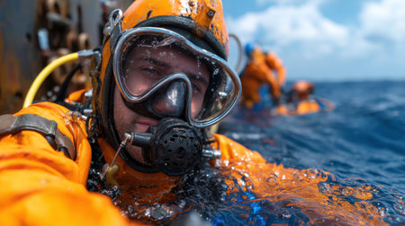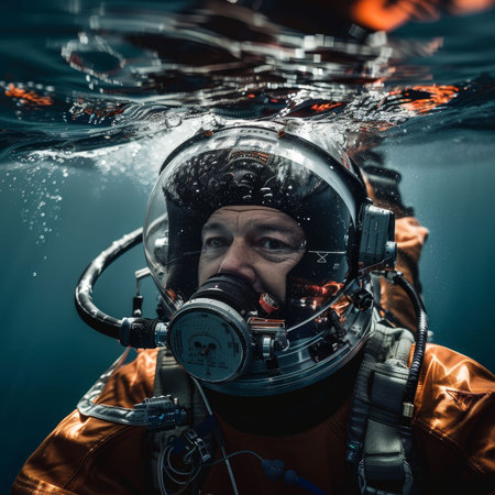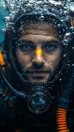 Close-up portrait of a man in a diving suit underwater.