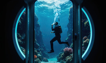 Aquatic Longevity Dive. Diving into underwater longevity chambers, aquanauts breathe enriched oxygen for tissue regeneration, coral cave background with bubble