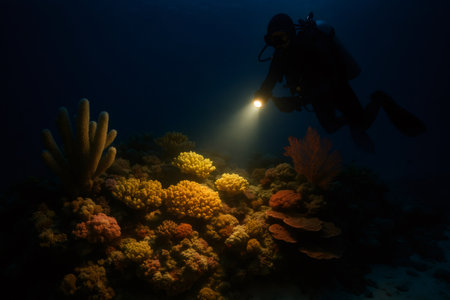 Scuba diver illuminating vibrant coral formations on a dark underwater reef ecosystem with a flashlight, exploring marine life