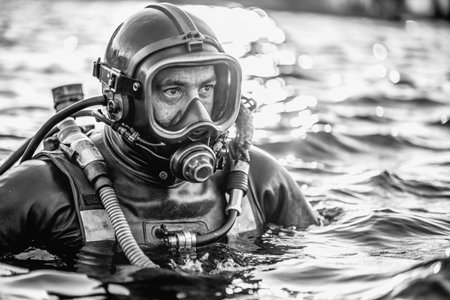 Professional firefighter diver wearing goggles for swimming. Generative AI