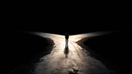 Person stands at a crossroads, facing two paths. Light contrasts sharply with darkness, creating a cinematic sense of choice.
