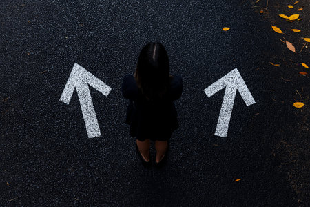A woman stands on asphalt, contemplating two directional arrows, symbolizing choices and decisions. scene evokes sense of introspection and uncertainty
