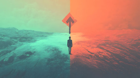 A person in formal attire stands at a marked intersection with vibrant arrows pointing in different directions under clear blue skies. The surroundings suggest a moment of decision-making.