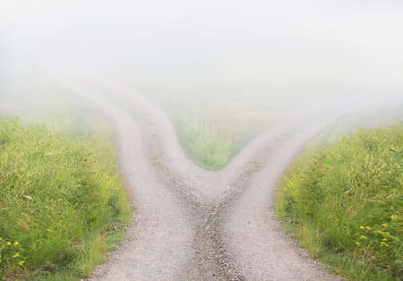 A man walks down a road that splits into two paths. The image has a moody and mysterious feel to it, as the man is alone and the road seems to be leading him into the unknown