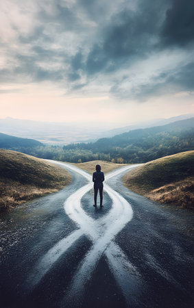 A solitary figure stands at a crossroads, contemplating choices under a dramatic sky, surrounded by natural beauty.