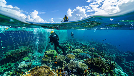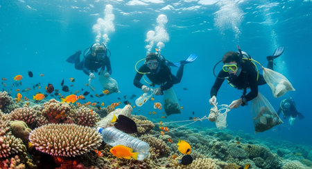 Three scuba divers collect plastic waste from a vibrant coral reef, preserving marine life. Underwater cleanup initiative showcasing environmental conservation. A critical step towards ocean