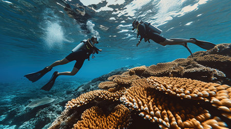 Experience the breathtaking beauty of an underwater world as divers and snorkelers discover vibrant coral reefs teeming with marine life Immerse yourself in the wonder and serenity of the marine ecosystem