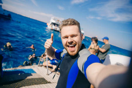 Selfie happy tourist man diver in wetsuit is preparing to dive into sea on boat. Concept diving trip Egypt