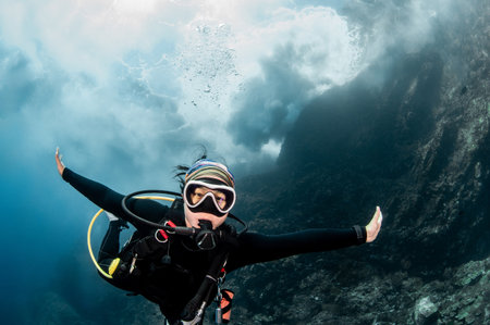 Asian female scuba diver looking at camera posing with the stunning wave breaking exploding above her head at Bon Island, Similan National Park, Thailand. Recreational underwater activity