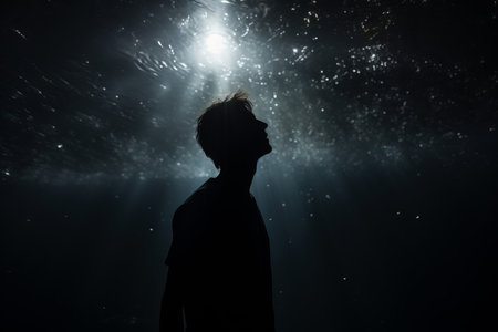 A person standing beneath the surface of the ocean, surrounded by deep blue waters, A menacing silhouette lurking in deep blue waters