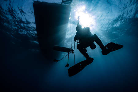 silhouette of scuba diver underwater in ocean under boat