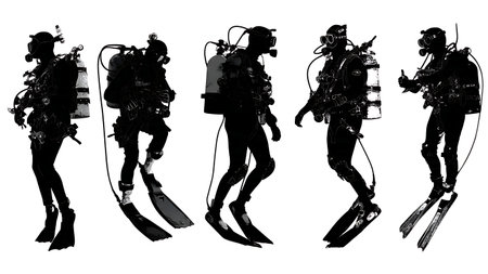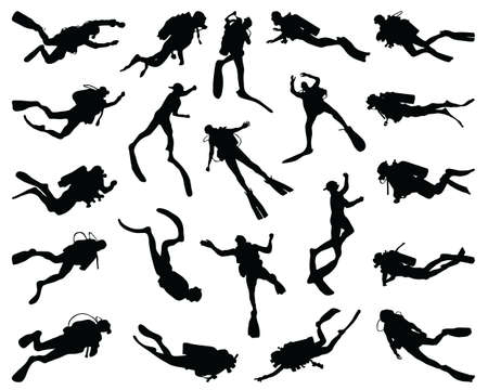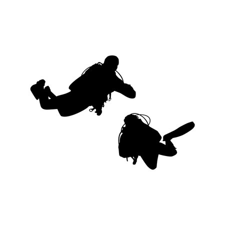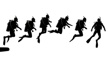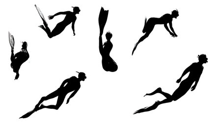 Black silhouettes of divers on a white background