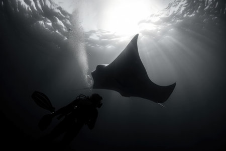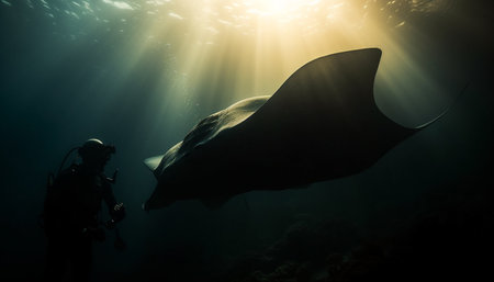 underwater photographer swimming with graceful manta ray in the open sea, created with generative ai