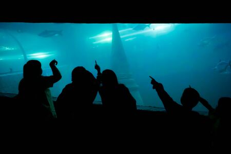 Silhouettes of people relaxing in a water park and looking at underwater life